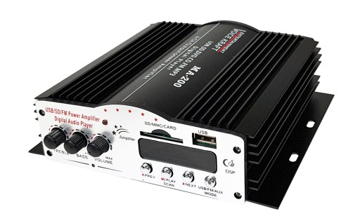 Wzmacniacz posiada wejście USB i SD dzięki czemu odtwarzać możemy pliki z muzyką w formacie mp3.