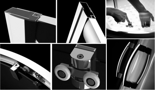 - Drzwi osadzone na łożyskowanych rolkach w chromowanych obudowach