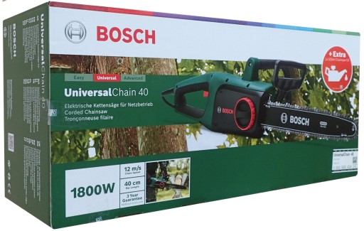 Bosch UniversalChain 40 to piła elektryczna o mocy 1800 W i prędkości łańcucha 12 m/s do cięcia drewna, małych i średnich drzew, pniaków, drewna opałowego i przycinania gałęzi. Niska waga 4,2 kg z i małe rozmiary umożliwia komfortową pracę i łatwe manewrowanie piłą.