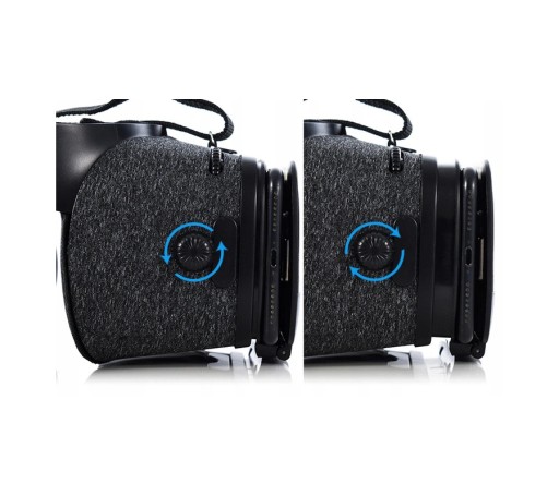 Aby uzyskać idealnie ostry obraz należy ustawić telefon w odpowiedniej pozycji. Użyj do tego pokręteł znajdujących na obudowie, którymi wyregulujesz odległość telefonu od soczewek. Na górnej części okularów umieszczone jest pokrętło służące do regulacji rozstawu soczewek względem siebie - bliżej lub dalej.