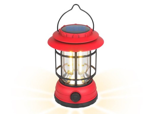 Funkcjonalna lampa campingowa stylizowana na klasyczne lampy naftowe, zasilana z wbudowanego akumulatora i panelu solarnego. Możliwość zawieszenia w namiocie (wbudowany uchwyt). Stanowi mocne źródło światła dzięki zastosowaniu diod LED. Posiada płynną regulację jasności świecenia. Wbudowany port USB umożliwia szybkie podładowanie lampy w wypadku braku światła słonecznego.