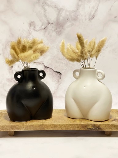 Nowoczesny wazon w kształtna pupa kobiety z suszonymi trawkami.