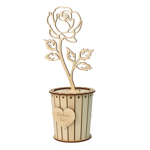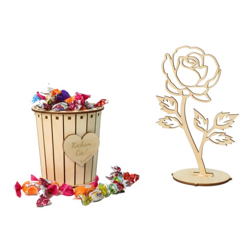 Drewniana doniczka z serduszkiem oraz kwiatkiem - różą to doskonały prezent dla kobiet każdej kobiety która lubi i kwiaty i słodycze.
