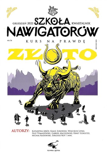"Kolejny, 34 numer kwartalnika "Szkoła nawigatorów" postanowiłem poświęcić relacjom człowieka ze złotem. Wśród tekstów znajdziemy materiał o złocie afrykańskim, o Pitagorejczykach, o Maksymilianie Kolbe, o gorączce złota w górach Black Hills, a także o Złotej Kaplicy w katedrze poznańskiej. - Gabriel Maciejewski (Klinika Języka)"