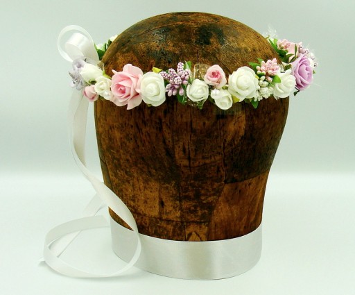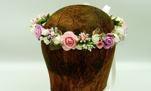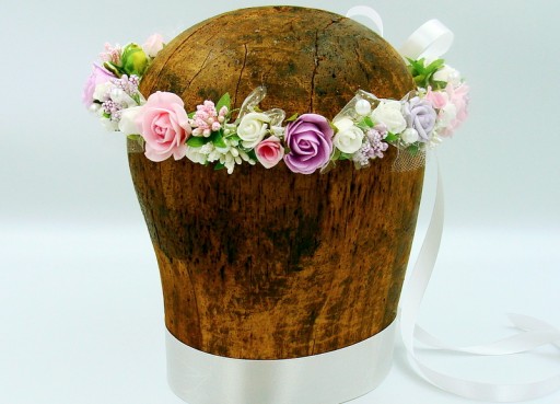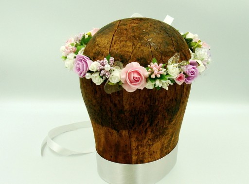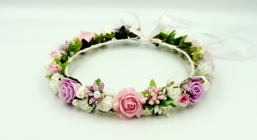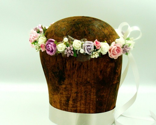 Wianek spleciony z białych, różowych i fioletowych różyczek piankowych, ozdobiony białymi, różowymi i fioletowym szyszeczkami. Dodatkowo zdobiony perłami.