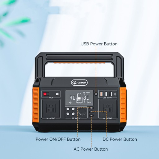 Flashfish P60 Power Station posiada wyjścia AC/DC/USB: 2 x wyjście 110 V AC (560 W), 4 x wyjście DC, 1 x port samochodowy, 3 x port USB-A i 1 x port szybkiego ładowania USB-C, który może zasilaj smartfon, tablet, laptop, kamerę, światło, drony, wentylatory, urządzenia samochodowe, urządzenie CPAP i inne w dowolnym momencie. Zarówno wyjścia DC, jak i USB mogą być używane, gdy stacja zasilająca ładuje się w tym samym czasie.