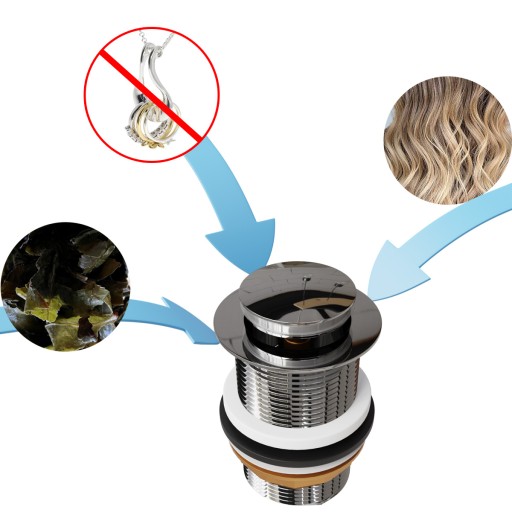 Ten łatwy w użyciu klik klak z łatwością wyłapuje włosy lub inne zanieczyszczenia podczas czyszczenia zlewu. A niski profil ułatwia wyłapywanie naszyjników, pierścionków lub innych przedmiotów przypadkowo upuszczonych do umywalki. Wymień swój stary korek już dziś na nasz prosty w obsłudze i montażu korek odpływowy typu „klik-klak”!