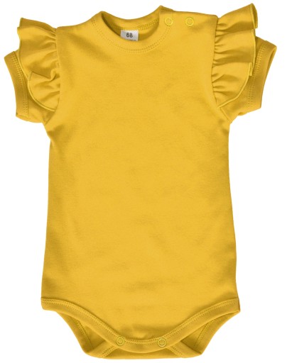 Klasyczne, wygodne i praktyczne body z krótkim rękawkiem i falbanką na ramionkach uszyte z wysokiej jakości bawełny posiadającej certyfikat Oeko-Tex Standard 100 Tekstylia godne zaufania.