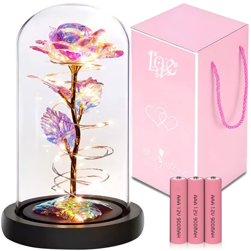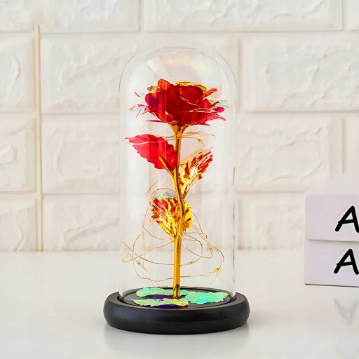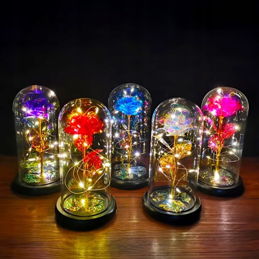 Róża otoczona jest lampkami LED, które sprawiają, że róża wygląda jeszcze bardziej wyjątkowo i elegancko. Stworzy piękną romantyczną dekorację sypialni bądź w salonie