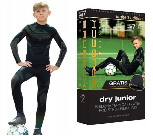 Kolekcja DRY Junior powstała przede wszystkim z myślą o najmłodszych miłośnikach piłki nożnej, którzy trenują lub rozgrywają mecze w kapryśnych warunkach pogodowych. Czasami warunki atmosferyczne skutecznie utrudniają wypoczynek na świeżym powietrzu. Największym wyzwaniem, nie jest, ani bardzo niska, ani bardzo wysoka temperatura. "Nie biegaj bo się spocisz i zachorujesz" - te słowa każdy z nas, choć raz skierował do swojego dziecka. Właśnie w takich momentach bielizna termoaktywna Brubeck Junior Dry jest znakomitym rozwiązaniem. Gdy Twoje dziecko się spoci, koszulka szybko odprowadzi wilgoć. Gdy na zewnątrz będzie chłodniej koszulka, getry i termoaktywna gratisowa czapka treningowa zagwarantują naturalne ciepło ciała.