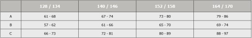A - obwód klatki piersiowej | B - obwód talii | C - obwód bioder