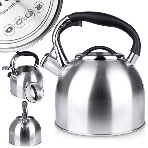 ✅ STALOWY - Klasyczny czajnik wykonany ze stali nierdzewnej w srebrnym kolorze. Posiada automatyczny gwizdek oraz zdejmowaną pokrywkę. Czajnik ma pojemność całkowitą 2,7 litra oraz wysokość 22 cm, pojemność użytkowa wynosi 2 litry.