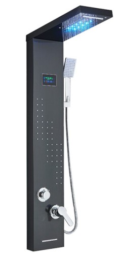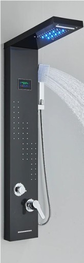 Ekskluzywny, stylowy, nowoczesny panel prysznicowy z hydromasażem, wodospadem, deszczownicą i diodami led.