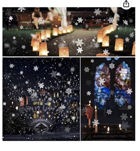 - Projektor z płatkami śniegu: Obracające się na niebie płatki śniegu, które wyglądają jak spadający z ciemnego nieba śnieg; tworzą realistyczną scenę śnieżną i silną atmosferę urlopu przede wszystkim podczas wesel, Bożego Narodzenia i innych uroczystości. Dzięki dynamicznym i statycznym płatkom śniegu możesz cieszyć się magicznym światem i sprawić swojej rodzinie wielką niespodziankę.
