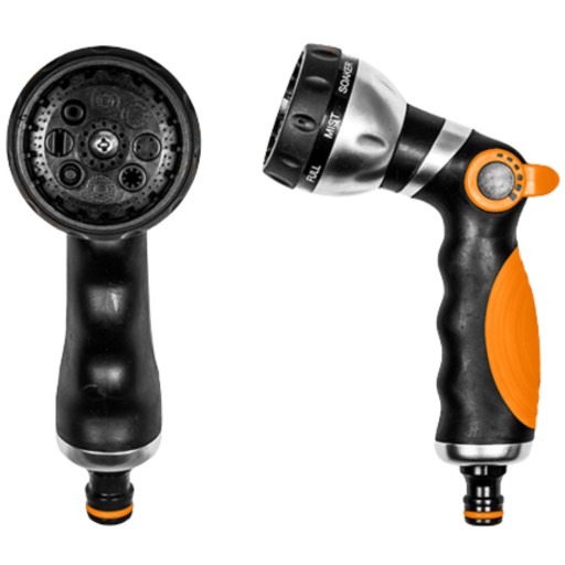 Metalowy pistolet 8-funkcyjny do zraszania. Pozwala podlewać różnymi strumieniami, tj: shower (prysznic), full (pełny), mist (mgła), soaker (krople), center (środek), jet (strumień), flat (płaski), cone (stożek). Maksymalny zasięg wody: