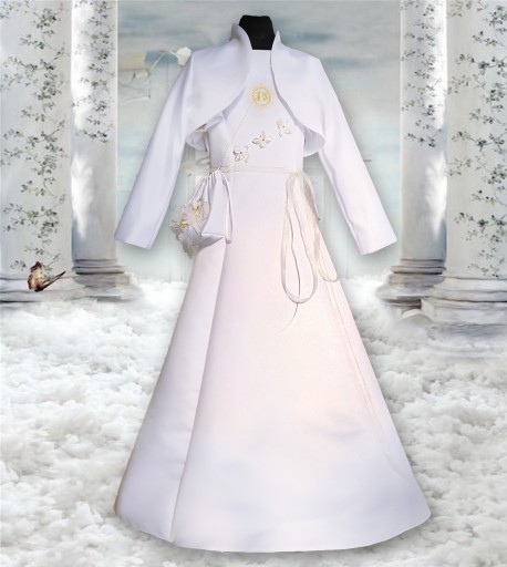 Zdobiona w pasie szyfonową biało złotą tasiemką. Na karczku kwiatuszki (lub na życzenie bez). Bolerko otwarte, torebeczka ze złoceniami. ( IHS do wyboru srebrny, złoty lub biały - wzory losowe.)