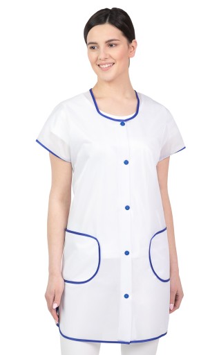 Fartuch ochronny damski w formie kimona. Wykonany z tkaniny 100% poliester dederon, z krótkim rękawem, zapinany na guziki, dwie kieszenie boczne. Przeznaczenie: fartuch przeznaczony jest dla osób pracujących w branżach: spożywczej, gastronomicznej, przemysłowej.