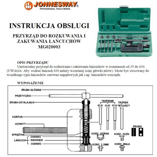 UWAGA: Aby rozkuć łańcuch 630 należy wcześniej ściąć główki nitów). Może być stosowany do wszelkiego typu łańcuchów zarówno napędowych jak i np. łańcuchów rozrządu.