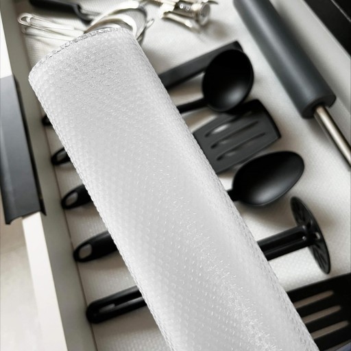 Podkładka do szafek i szuflad jest niezwykle prosta w obsłudze. Wystarczy jedynie dobrać odpowiednią długość i szerokość, a następnie przeciąć ją nożyczkami lub nożem. Dzięki wszechstronności produktu użyjesz go np.: