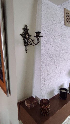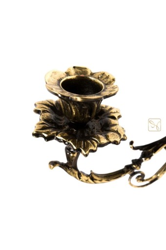 Świecznik odlany z mosiądzu przez rodzimego rzemieślnika - wspieramy polskie rzemiosło. Podstawa wydłużona, bogato zdobiona z wizerunkiem twarzy kobiety. Dekoracyjne ramię świecznika na stałe przykręcone prostopadle od ściany. Kinkiet utrzymany w antycznym charakterze, przepolerowany w miejscach eksponowanych, ciemniejszy w zakamarkach. Mosiężny świecznik został pokryty lakierem zapobiegającym utlenianiu się mosiądzu. Zawieszenie na jednym haczyku, typ hak prosty.
