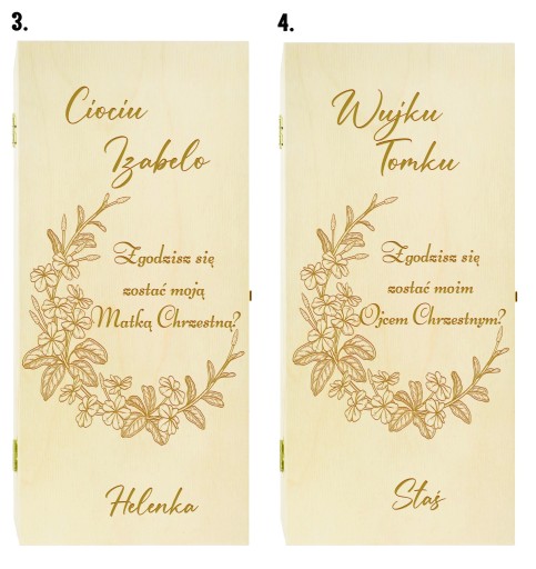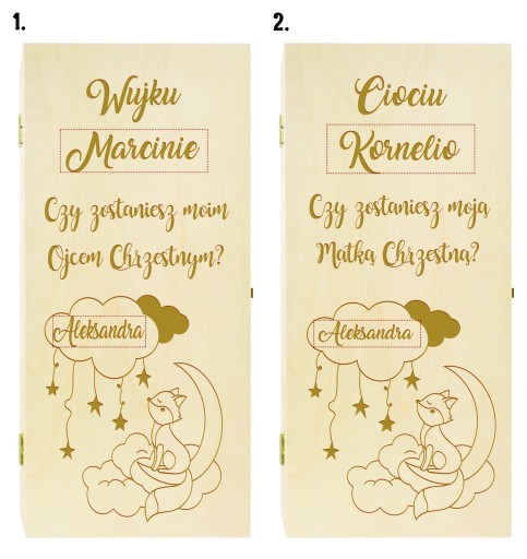 Skrzynka na wino jest nietuzinkowym pomysłem w sytuacji, gdy chcemy zadać bardzo ważne pytanie. Naniesiony na skrzynkę grawer nie jest zwykłą prośbą. Taki upominek podkreśla rangę wydarzenia i rolę jaką będą pełnili dla naszej pociechy Rodzice Chrzestni.