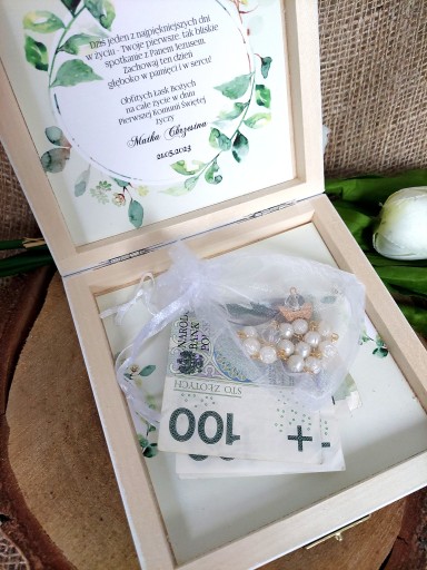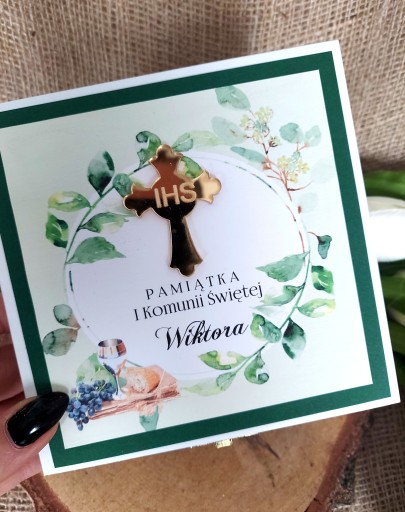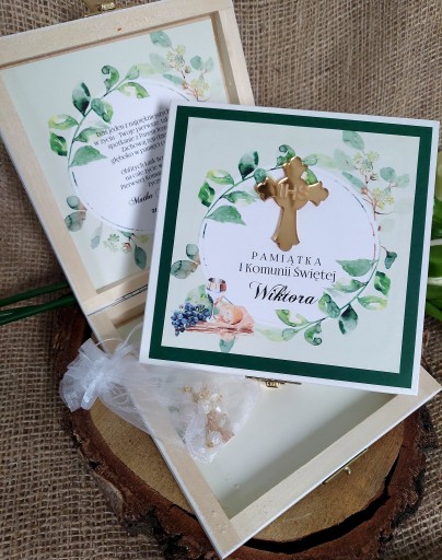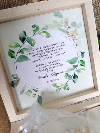 Drewniane pudełeczko z personalizowanymi życzeniami i ZŁOTYM RÓŻAŃCEM