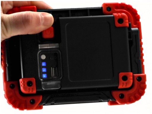 ✅ Naświetlacz z akumulatorem z tyłu posiada wskaźnik poziomu baterii, który pokazuje, ile energii pozostało w akumulatorze.