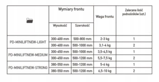 - maksymalna waga frontu wynosi 10 kg przy zastosowaniu dwóch podnośników;