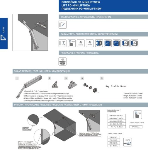 Podnośnik MINILIFT jest przeznaczony do mocowania frontów. Idealnie sprawdzi się przy montażu małych szaf oraz szafek górnych – zapewniając zarówno wygodny dostęp do ich zawartości jak i bezpieczne użytkowanie. Podnośnik MINILIFT wyróżnia się modnym, minimalistycznym designem. Jest dostępny w dwóch wersjach kolorystycznych: chrom oraz czerń. Podnośnik daje możliwość instalacji pod cichy domyk oraz push to open. Dzięki opcji push to open – czyli naciśnięciu frontu – szafka łatwo się otwiera i nie wymaga montowania uchwytów. Natomiast cichy domyk – zapobiega głośnemu uderzaniu frontu szafki przy zamykaniu.