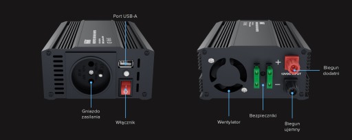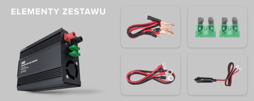 - zmienia napięcia prądu stałego z akumulatora lub zapalniczki samochodowej 12 V na prąd zmienny ~230 W