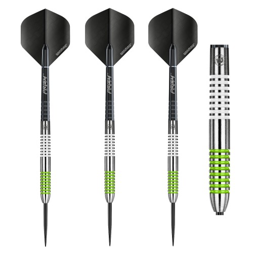 Lotki steel Winmau Ton Machine. Opakowanie zawiera 3 kompletne lotki z piórkami i shaftami. Wykonane z naturalnego srebrnego wolframu z białymi i zielonymi wypustkami.