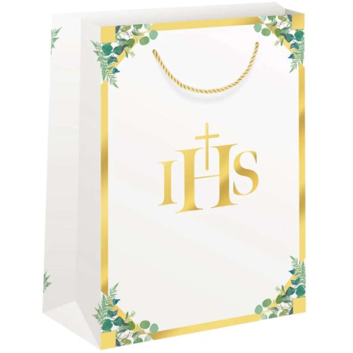 Torebka prezentowa z okazji I Komunii wykonana z papieru, w subtelnej kolorystyce złota i złamanej bieli nawiązującej do Komunii Świętej. Torebka posiada poręczny uchwyt wykonany ze złotego sznurka i piękne złote zdobienia na rantach torebki. Warto zadbać o to by wręczany na Komunię prezent czy upominek był zapakowany w prosty a jednocześnie elegancki sposób.