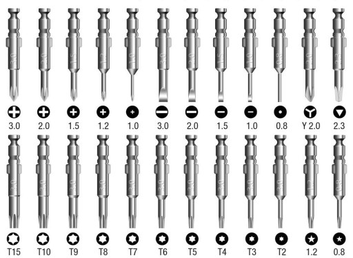 - Krzyżakowy śrubokręt: 1.0, 1.2, 1,5, 2.0, 3.0