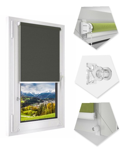 Roleta materiałowa, komplet elementów potrzebnych do bezinwazyjnego montażu - bez wiercenia, prowadnica żyłkowa, instrukcja montażu, napinacz łańcuszka