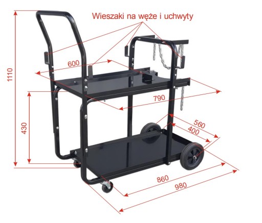 Wózek spawalniczy TIG/MIG jest lekkim podwoziem transportowym przeznaczonym do przewozu zestawów spawalniczych TIG, MIG lub plazmowych, jak również do dowolnego wykorzystania w pomieszczeniach warsztatowych. Pasuje do większości urządzeń spawalniczych i chłodnic. Dostarczany jest w paczce, jako zestaw do samodzielnego montażu.