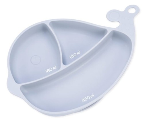 Z tym zestawem jedzenie posiłków zmieni się w smakowitą zabawę! W jego skład wchodzi silikonowy talerzyk w kształcie wieloryba i komplet sztućców (widelec oraz łyżka), wykonanych ze stali nierdzewnej oraz silikonu. Talerzyk posiada trzy przegródki, a każda z nich ma inną pojemność, co pozwala na odpowiednie rozmieszczenie poszczególnych elementów posiłku. W podstawie talerzyka znajduje się silikonowa przyssawka, która zapobiega przesuwaniu się talerza, ułatwiając tym samym maluchowi samodzielne jedzenie. Sztućce wyposażone są w silikonowe uchwyty, które zapobiegają niekontrolowanemu wyślizgiwaniu się łyżki czy widelca z rączki.