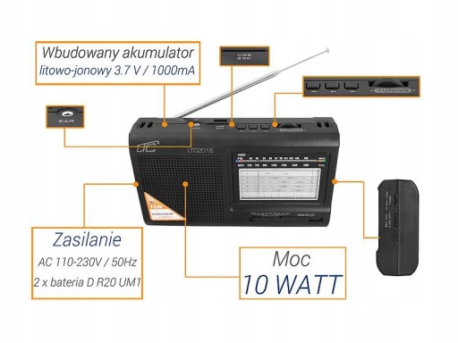 Radio przenośne LTC-2016 WILGA USB z wbudowanym akumulatorem, CZARNE.