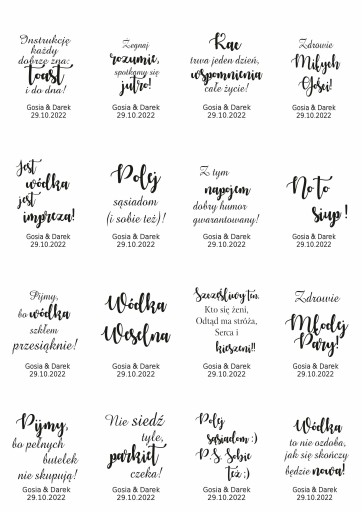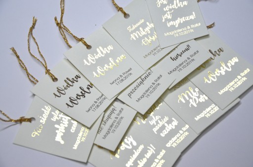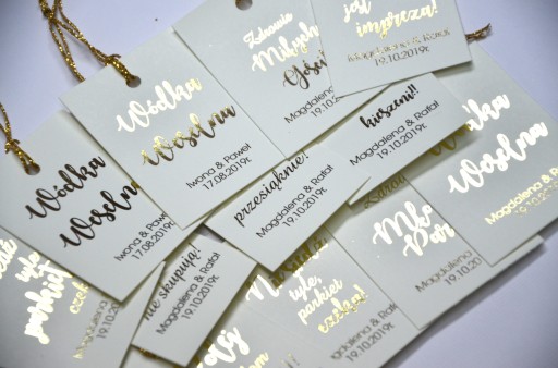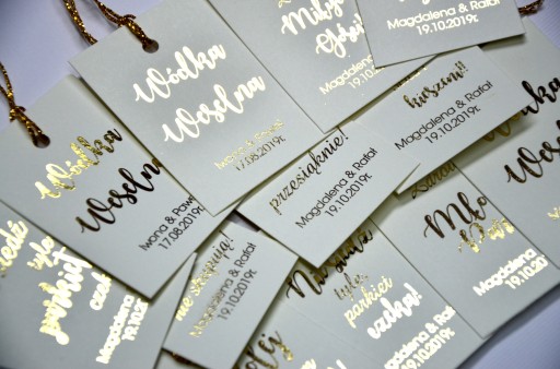 W cenie otrzymają Państwo 1 komplet czyli 48 Sztuk zawieszek spersonalizowanych na alkohol z różnymi tekstami mix spośród 16 wzorów tekstów + złote sznureczki