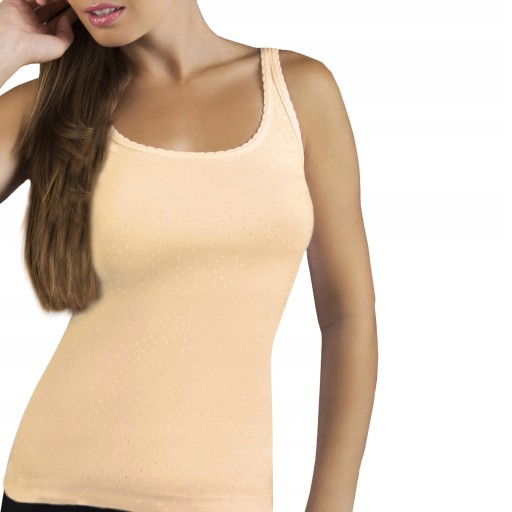 To propozycja dla pań łączących wygodę z elegancją i stylem każdego dnia. Jednolita koszulka występująca w bazowej kolorystyce będzie idealnym uzupełnieniem każdej stylizacji! Została wykonana z najwyższej jakości materiału, zapewniającej dużą wytrzymalość, przewiewność i wysoki komfort noszenia, jest przy tym mięciutka i miła w dotyku niczym puch. Podkreśla figurę, idealnie dopasowuje się do kształtów ciała, nie marszczy się. Ładny krój (dekolt lekko spiczasty wykonczony kwiatowym wzorem) świetnie nadaje się zarówno pod obcisłą bluzkę, jak i do samodzielnego noszenia. Słowem: luksus wygody - przy perfekcyjnej prezentacji.