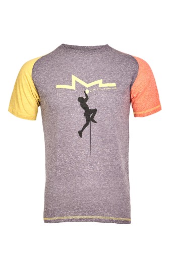 Koszulka wspinaczkowa z ciekawym nadrukiem wykonana w 62% z poliestru, 25 % z bawełny i 13% z rayonu.
