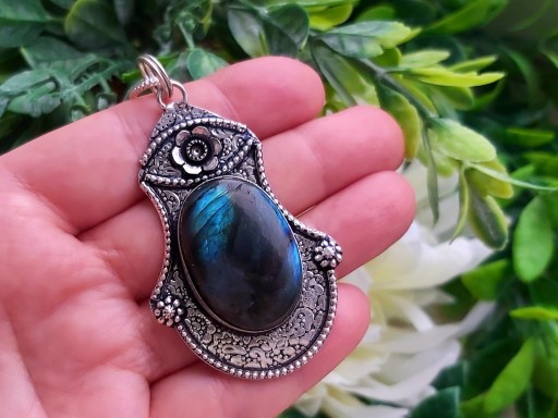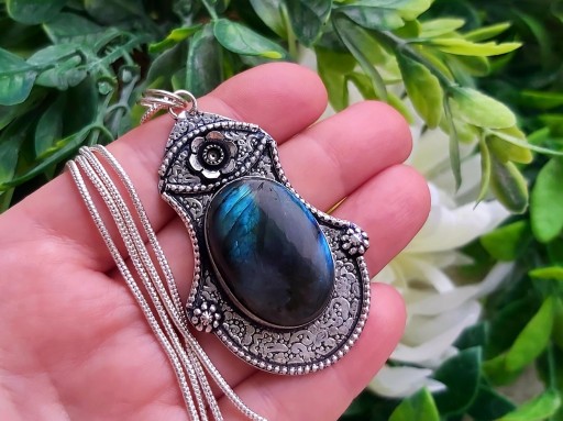 Zrobiono z indyjskiego srebra(ze stopu srebra i miedzi).Centrum wisiorka zdobi oprawiony naturalny Labradoryt Ognisty. Ręczne wykonanie indyjskiego jubilera. Nowy bez metki.