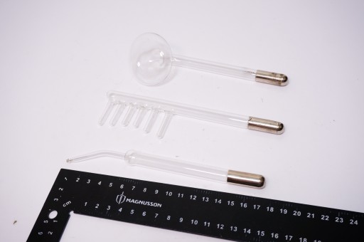 Darsonval - prądy o wysokiej częstotliwości.Prądy o wysokiej częstotliwości - zwane w kosmetyce prądami Darsonvala wykorzystuje się w celu pobudzenia przemiany materii, wzmocnienia przepływu krwi w skórze powodując miejscowe przekrwienie, ale przede wszystkim mają one działanie powierzchniowo dezynfekujące i antyseptyczne.Darsonval jest aparatem podłączanym bezpośrednio do sieci elektrycznej .Urządzenie jest niezwykle poręczne i zwarte, uchwyt ma wbudowany włącznik / wyłącznik jednocześnie regulujący natężenie prądu. W wyposażeniu urządzenia znajdują się ponadto 4 elektrody szklane, które można wybierać w zależności od powierzchni skóry poddawanej zabiegowi.- Elektroda prętowa (sztyftowa) - do usuwania pojedynczych zanieczyszczeń.- Elektroda w kształcie grzyba (grzybek) - nadaje się do dezynfekcji całej twarzy.- Elektroda łezka (łyżeczka) - do trudniej dostępnych powierzchni np. wgłębienia wokół nosa,- Elektroda grzebieniowa - do rewitalizacji skóry głowy, pobudza porost włosów, zapobiega wypadaniu włosów.Moc 10w