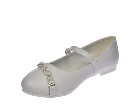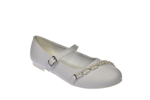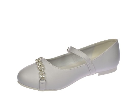 Buty dziewczęce komunijne białe, wykonane z eko skóry, na 1 cm obcasie.