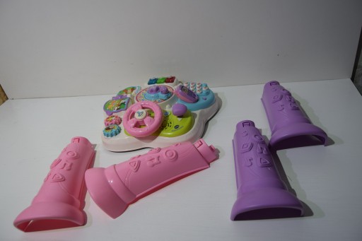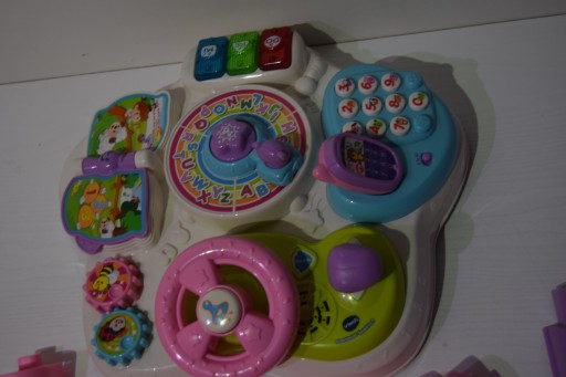 - Stół do zabawy z kierownicą z klaksonem, gałką zmiany biegów, telefonem, książką i kołami zębatymi