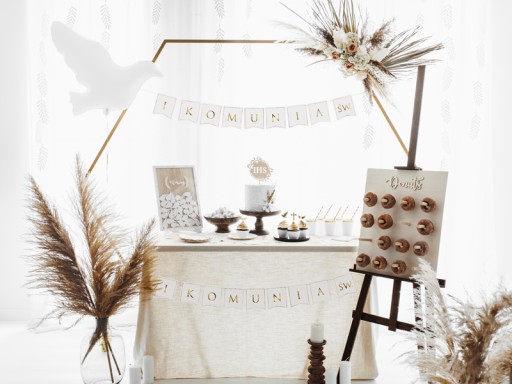 Baner na Pierwszą Komunię Święta wykonany z grubego papieru. Zestaw zawiera litery do samodzielnego zawieszenia na sznurku (dołączony do zestawu).