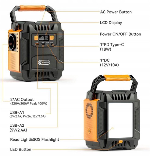 - Przenośny generator baterii FF FlashFish ma system bezpieczeństwa chroniący generator przed zwarciem, nadmiernym prądem, przepięciem, niskim napięciem i nadmierną temperaturą. W połączeniu z 12-miesięczną gwarancją sprawia, że korzystanie z niego jest bezpieczniejsze. Idealny przenośny zasilacz do użytku domowego, materiałów kempingowych i innych zajęć na świeżym powietrzu.