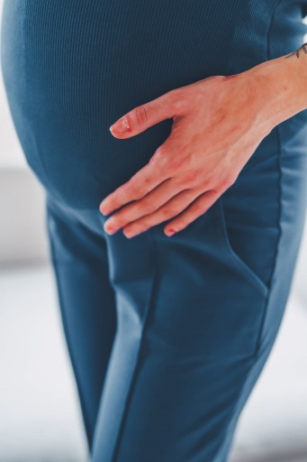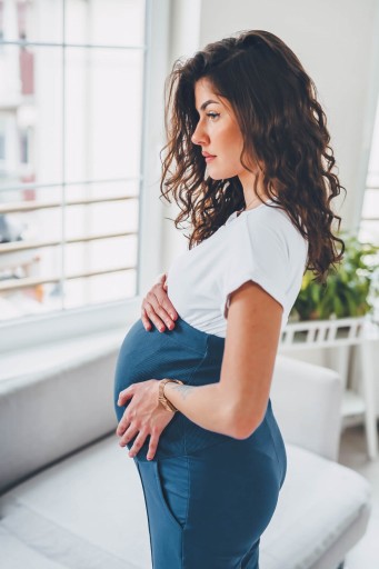 Spodnie wykończone szerokim pasem, dopasowującym się do rosnącego brzuszka przyszłej mamy.