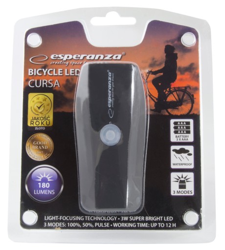 Lampka rowerowa przednia Esperanza CURSA posiada mocną białą diodę LED, emitującą silne światło o strumieniu 180 lumenów. Dzięki niej, po zmroku droga przed Tobą będzie bardzo dobrze oświetlona, a Ty będziesz widoczny dla innych użytkowników ruchu. Urządzenie dysponuje 3 trybami świecenia.