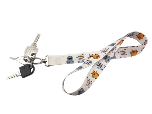 Smycz z nadrukiem w kotki o szerokości 20mm z metalowym srebrnym karabińczykiem do kluczy