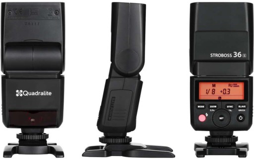 Quadralite Stroboss 36 to mała i lekka lampa błyskowa o liczbie przewodniej 36, która idealnie pasuje do aparatów bezlusterkowych oraz kompaktowych. Waży jedynie 200g a po zamontowaniu na aparat i skierowaniu głowicy do przodu ma jedynie 95mm wysokości. Pomimo tak niewielkich rozmiarów jej głowica błyskowa obraca się w zakresie 270º w płaszczyźnie poziomej oraz 97º w pionowej. Pozwala to na dużą swobodę w odbijaniu światła błyskowego od sufitu i ścian niezależnie od zorientowania aparatu na zdjęcia w kadrze portretowym i poziomym.